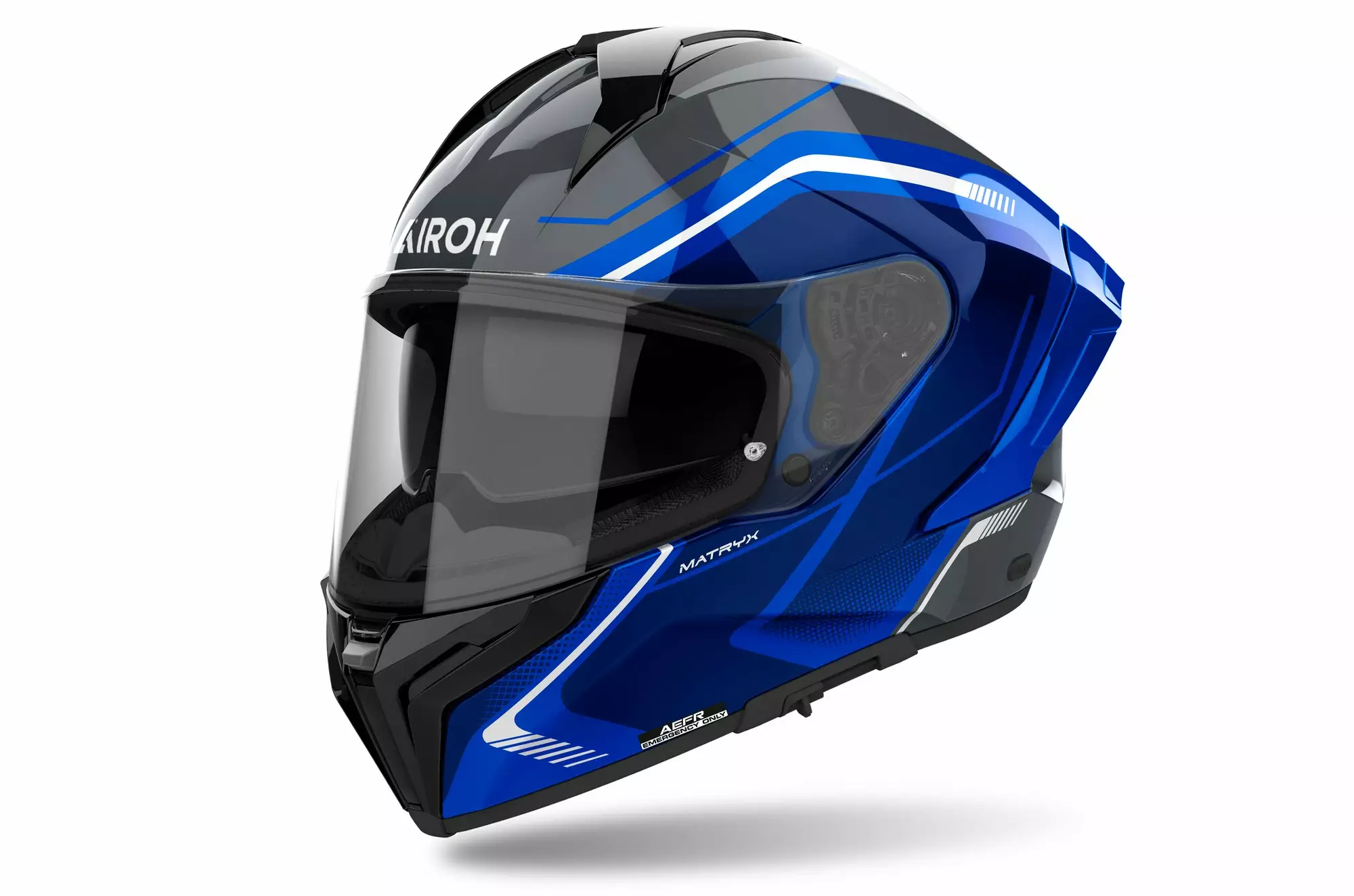 Visir: extra bred sikt, ATVR (Airoh Tool-less Visor Removal), A3S (Airoh Automatic Antifog System), låsningssystem, rep- och UV-resistent