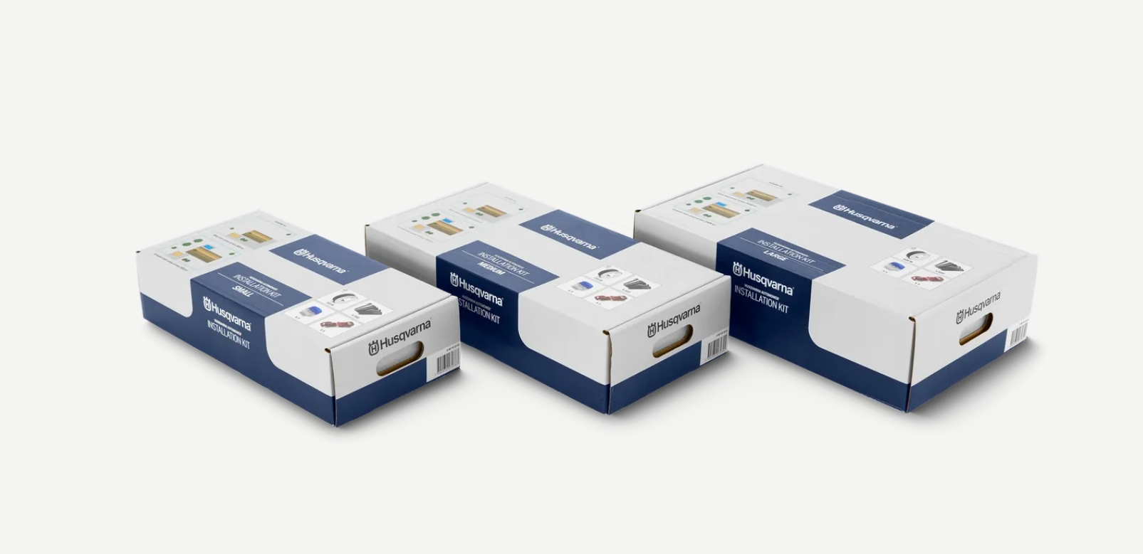 Installationskit som innehåller begränsningskabel, märlor, skarvdon och anslutningskontakter i olika antal och längd, passande din trädgård. Installationskit litet - Passande öppna ytor på maximalt 800 m² eller komplexa ytor på maximalt 400 m². Installationskit mellan - Passande öppna ytor på maximalt 2000 m² eller komplexa ytor på maximalt 1000 m². Installationskit stort - Passande öppna ytor på maximalt 5000 m² eller komplexa ytor på maximalt 2500 m².